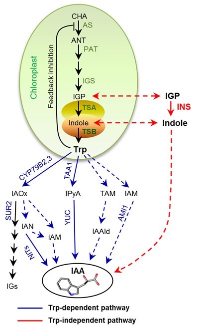 中科院遗传发育所植物基因组学国家重点实验室李家洋课题组长期从事非依赖于色氨酸生长素合成途径的研究。该课题组前期研究表明,吲哚甘油磷酸(IGP)是色氨酸合成与非依赖于色氨酸生长素合成途径的分支点,拟南芥吲哚合酶(Indole Synthase, INS)是色氨酸合成α亚基(TSA)的同源蛋白,可能具有催化IGP合成吲哚的功能(Ouyang et al., Plant J, 24: 327, 2000)。为进一步探索INS的生物学功能,李家洋等对INS功能缺失突变体ins-1和ins-2以及TSA的一个弱等位突变体trp3-1进行了遗传分析,发现ins-1的胚胎发育异常,trp3-1的胚胎发育与野生型相似,而ins-1 trp3-1双突变体表现出完全的胚胎致死。INS蛋白在胚胎发育过程中具有时空特异性的表达模式,胚珠生长素含量测定以及对胚胎中生长素报告基因DR5-GFP表达特征的分析表明,非依赖于色氨酸生长素合成途径对于早期胚胎发育过程中顶-基部轴向的建立发挥重要作用。系统的遗传学、代谢物含量测定以及细胞学研究显示INS定位于细胞质中,参与非依赖于色氨酸生长素合成途径中从IGP生成吲哚的代谢反应,是非依赖于色氨酸生长素合成途径中第一个被鉴定的重要成员。